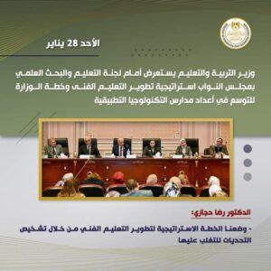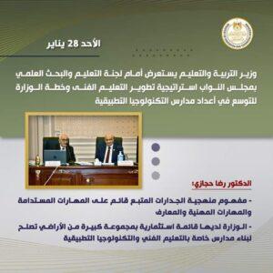 استعرض الدكتور رضا حجازي وزير التربية والتعليم والتعليم الفني أمام لجنة التعليم والبحث العلمي بمجلس النواب استراتيجية تطوير التعليم الفنى وخطة الوزارة للتوسع في أعداد مدارس التكنولوجيا التطبيقية.