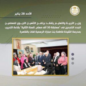 تفقد الدكتور رضا حجازى وزير التربية والتعليم والتعليم الفني، اليوم الأول لبدء برنامج التأهيل التربوي للمعلمين الناجحين فى “مسابقة ٣٠ ألف معلم..السنة الثانية”، والبالغ عددهم (٢٠٨٦٦ معلما) الذين اجتازوا الاختبارات الإلكترونية بالجهاز المركزي للتنظيم والإدارة، وذلك بقاعة التدريب بمدرسة الشيخة فاطمة بنت مبارك الرسمية لغات بالقاهرة، حيث يتم التدريب على مستوى الجمهورية وتبلغ عدد القاعات التدريبية ١٠٣٨ قاعة، بالإضافة إلى ١٥ مركز تدريب رئيسى.