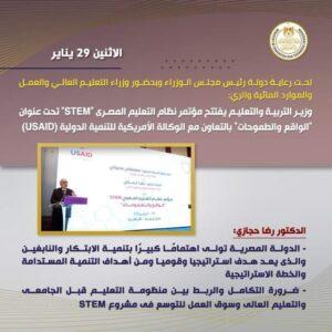 تحت رعاية دولة رئيس مجلس الوزراء، افتتح الدكتور رضا حجازى وزير التربية والتعليم والتعليم الفنى، مؤتمر نظام التعليم المصرى ”STEM” تحت عنوان “الواقع والطموحات”، بالتعاون مع الوكالة الأمريكية للتنمية الدولية (USAID) والمنعقد خلال يومي ٢٩ و٣٠ يناير ٢٠٢٤.