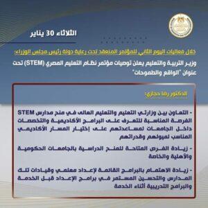 كما قال الوزير إنه انطلاقا من الحرص الدائم للقيادة السياسية على تطوير نظام التعليم، وحرصا على تعزيز التفكير العلمي وتطوير المهارات التكنولوجية لدى الطلاب والطالبات في مرحلة مبكرة من مسيرتهم، فقد تبنت الدولة العمل على التوسّع في منظومة تعليم “STEM” عن طريق إنشاء المزيد من مدارس المتفوقين فى العلوم والتكنولوجيا، بحيث يتم إنشاء مدرسة واحدة على الأقل بكل محافظة من محافظات الجمهورية وفقاً للنموذج الحالى لهذه النوعية من المدارس الثانوية ، بالإضافة إلى التوسع فى تبنى استراتيجيات البحث العلمي والتعلم من خلال المشروعات فى سنوات النقل بالتعليم العام، كذلك ووفقا لتوجهات الدولة، يتم الاعداد لتقديم نماذج أخرى من مدارس STEM – خاصة فى المرحلة الثانوية – تعمل بنظام اليوم الكامل، وذلك تلبيةً لاحتياجات الدولة من الطلاب الباحثين والمتميزين وإعدادهم للمساهمة فى تحقيق أهداف التنمية.