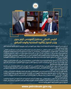 استقبل رئيس الجمهورية اللبنانية الشقيقة العماد جوزاف عون، المهندس كريم بدوي وزير البترول والثروة المعدنية، خلال زيارته الرسمية إلى لبنان .