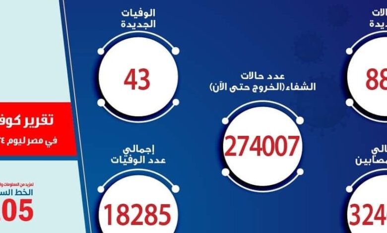 وذكر “مجاهد” أن إجمالي العدد الذي تم تسجيله في مصر بفيروس كورونا المستجد حتى الأحد، هو 324619 من ضمنهم 274007 حالة تم شفاؤها، و 18285 حالة وفاة.