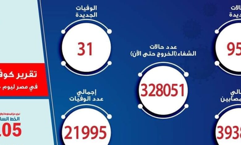 وأشار “عبد الغفار” إلى أن إجمالي العدد الذي تم تسجيله في مصر بفيروس كورونا المستجد حتى الإثنين، هو 393808 من ضمنهم 328051 حالة تم شفاؤها، و 21995 حالة وفاة.