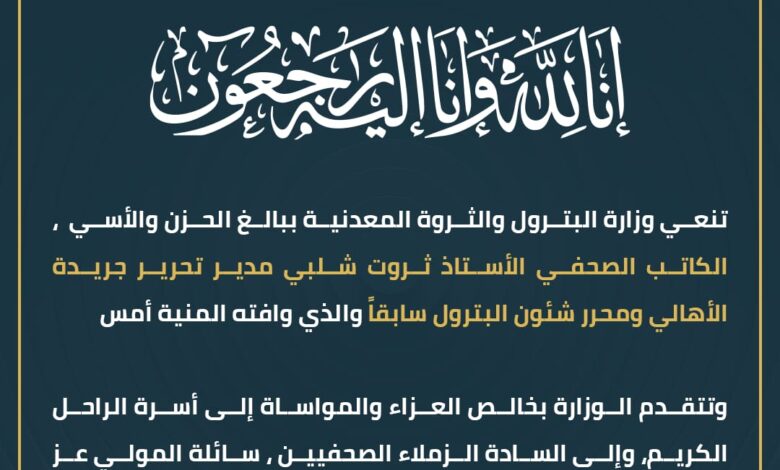 نعت وزارة البترول والثروة المعدنية ببالغ الحزن والأسى ، الكاتب الصحفي الأستاذ ثروت شلبي مدير تحرير جريدة الأهالي ومحرر شئون البترول سابقاً والذي وافته المنية أمس .