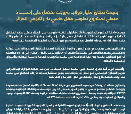 حصلت شركة المشروعات البترولية والاستشارات الفنية “بتروجت” على إسناد مبدئي لعقد المقاول العام لمشروع تطوير المرحلة الثانية لحقل حاسي بئر ركايز في الجزائر، بقيمة 1.087 مليار دولار، وذلك عقب اجتياز الشركة لمرحلة التأهيل بعد منافسة مع كبرى الشركات العالمية المتقدمة للمناقصة.