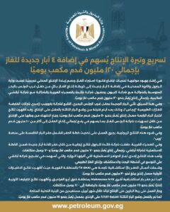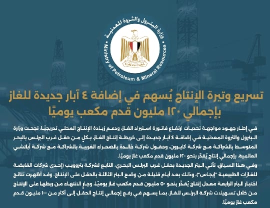 في إطار جهود مواجهة تحديات ارتفاع فاتورة استيراد الغاز، ودعم زيادة الإنتاج المحلي تدريجيًا، نجحت وزارة البترول والثروة المعدنية في إضافة 4 آبار جديدة إلى خريطة إنتاج الغاز، بكلٍ من حقل غرب البرلس بالبحر المتوسط بالشراكة مع شركة كايرون، وحقول شركة خالدة بالصحراء الغربية بالشراكة مع شركة أباتشي العالمية، بإجمالي إنتاج يُقدَّر بنحو 120 مليون قدم مكعب غاز يوميًا.