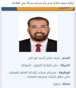 امين الشباب وعضو المجلس التنفيذي للنقابة العامة للعاملين بالبترول لترقيته وشفل وظيفة مدير عام مساعد بالإدارة العامة للعمليات بشركة عش الملاحه للبترول اشبيتكو