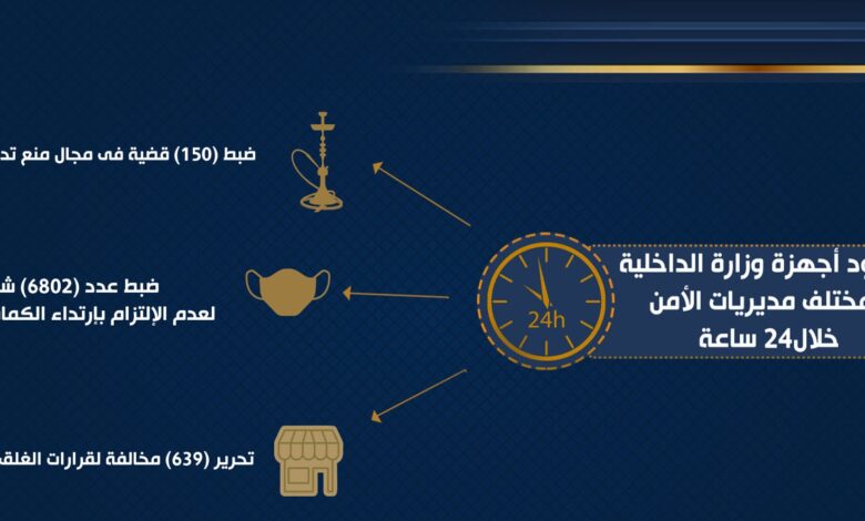 ضبط عدد (6802) شخص لعدم إرتدائهم الكمامات الواقية ، وتم التصالح وسداد الغرامة المقررة لعدد (6773) شخص ، وإتخاذ الإجراءات القانونية والعرض على النيابة العامة حيال (29) شخص لم يسددوا الغرامة المقررة.
