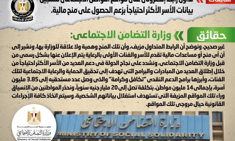 يتم الإعلان عنها بشكل رسمي من قبل وزارة التضامن الاجتماعي، مُشددةً على نجاح الدولة في دعم العديد من الأسر الأكثر احتياجاً من خلال إطلاق العديد من المبادرات والبرامج التي تهدف إلى تحقيق الحماية والرعاية الاجتماعية لتلك الفئات، وأبرزها برامج الدعم النقدي “تكافل وكرامة” والذي وصل عدد مستحقيه إلى 3.85 مليون أسرة، بإجمالي 14 مليون مواطن، بتكلفة تصل إلى 20 مليار جنيه سنوياً، مُحذرةً المواطنين من الانسياق وراء تلك المواقع المزيفة التي تستهدف استغلال بياناتهم الشخصية، وسيتم اتخاذ كافة الإجراءات القانونية حيال مروجي تلك المواقع.