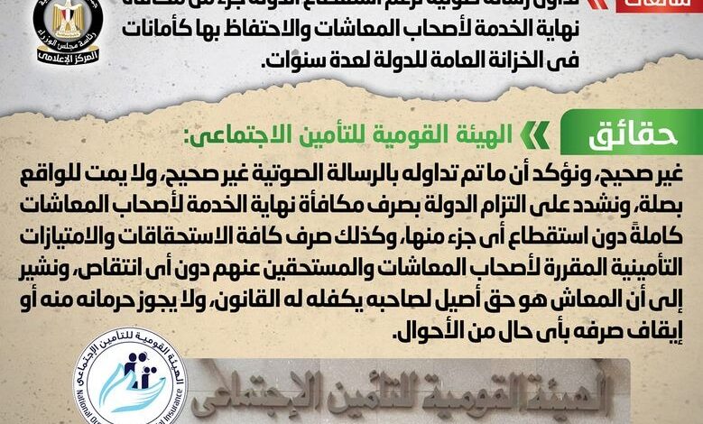 تداولت بعض مواقع التواصل الاجتماعي رسالة صوتية تزعم استقطاع الدولة جزء من مكافأة نهاية الخدمة لأصحاب المعاشات والاحتفاظ بها كأمانات في الخزانة العامة للدولة لعدة سنوات، وقد قام المركز الإعلامي لمجلس الوزراء بالتواصل مع الهيئة القومية للتأمين الاجتماعي، والتي نفت تلك الأنباء، مُؤكدةً أنه لا صحة لاستقطاع أي جزء من مكافأة نهاية الخدمة لأصحاب المعاشات أو الاحتفاظ بها كأمانات في الخزانة العامة للدولة لعدة سنوات، وأن ما تم تداوله بالرسالة الصوتية غير صحيح ولا يمت للواقع بصلة، مُشددةً على التزام الدولة بصرف مكافأة نهاية الخدمة لأصحاب المعاشات كاملةً دون استقطاع أي جزء منها، وكذلك صرف كافة الاستحقاقات والامتيازات التأمينية المقررة لأصحاب المعاشات والمستحقين عنهم دون أي انتقاص، مشيرةً إلى أن المعاش هو حق أصيل لصاحبه يكفله له القانون، ولا يجوز حرمانه منه أو إيقاف صرفه بأي حال من الأحوال.