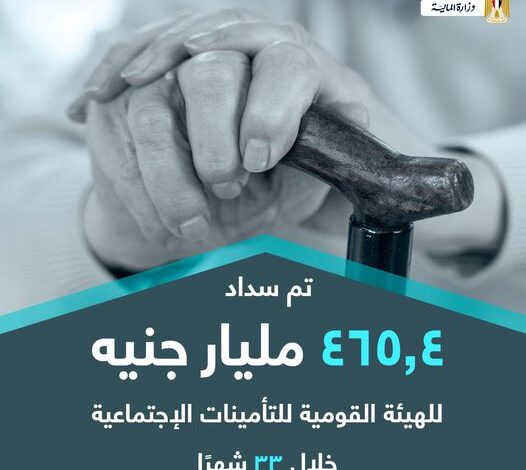 الخزانة العامة للدولة انتهت من تحويل ٤٦٥,٤ مليار جنيه للهيئة القومية للتأمينات الاجتماعية خلال ٣٣ شهرًا، ليصل إجمالى ما تم تحويله من الخزانة لصندوق «المعاشات والتأمينات» ٥١٠,٥ مليار جنيه بنهاية يونيه المقبل … وده يضمن توفير السيولة المالية اللازمة لخدمة أصحاب المعاشات والمستحقين عنهم والمؤمن عليهم والوفاء بكامل الالتزامات تجاههم.