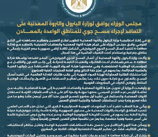مجلس الوزراء : يوافق لوزارة البترول والثروة المعدنية على التعاقد لإجراء مسح جوي للمناطق الواعدة بالمعادن