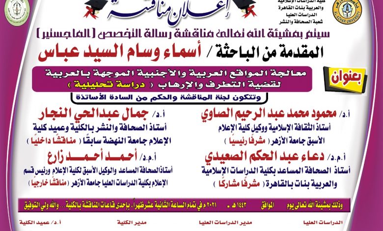 تشهد كلية الدراسات الإسلامية والعربية بنات جامعة الأزهر فرع القاهرة، السبت المقبل، مناقشة رسالة ماجستير تحت عنوان: “معالجة المواقع العربية والأجنبية الموجهة بالعربية لقضية التطرف والإرهاب”، والمقدمة من الباحثة أسماء عباس .