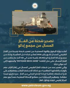 وزارة البترول والثروة المعدنية : تعلن عن تصدير شحنة جديدة من الغاز الطبيعي المسال لشهر يناير 2026 لصالح شركة “شل” العالمية،