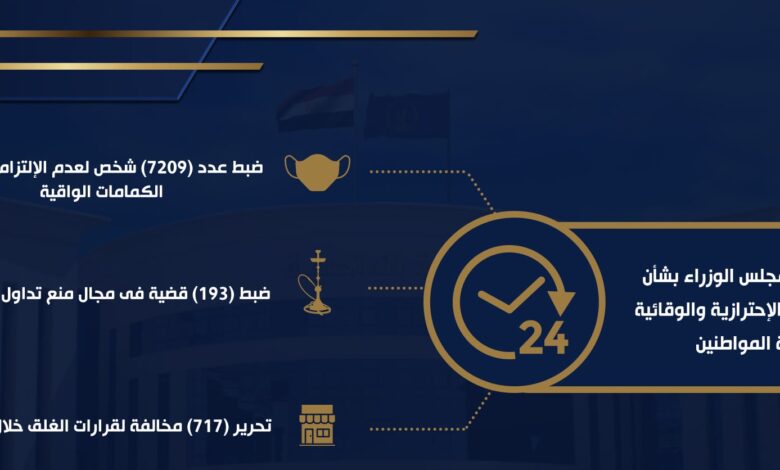 ضبط عدد (7209) شخص لعدم إرتدائهم الكمامات الواقية ، وتم التصالح وسداد الغرامة المقررة لعدد (7184) شخص ، وإتخاذ الإجراءات القانونية والعرض على النيابة العامة حيال (25) شخص لم يسددوا الغرامة المقررة.
