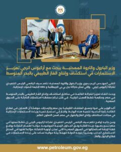 وزير البترول والثروة المعدنية : يبحث مع أركيوس انرجي تعزيز الاستثمارات في استكشاف وإنتاج الغاز الطبيعي بالبحر المتوسط ،