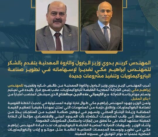 وزير البترول : يتقدم بالشكر للمهندس ابراهيم مكي تقديرا لإسهاماته في تطوير صناعة البتروكيماويات وتنفيذ مشروعات جديدة*