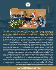 وزير البترول : يناقش الخطة الجديدة للإستكشاف والإنتاج مع رؤساء الشركات العالمية العاملة في مصر