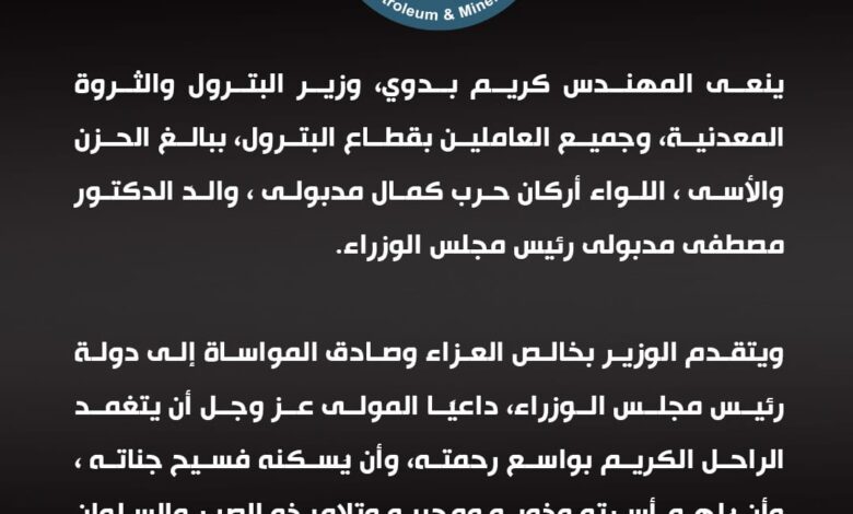 ينعى المهندس كريم بدوي، وزير البترول والثروة المعدنية، وجميع العاملين بقطاع البترول، ببالغ الحزن والأسى، *اللواء أركان حرب كمال مدبولي،* والدَ الدكتور مصطفى مدبولي رئيس مجلس الوزراء.