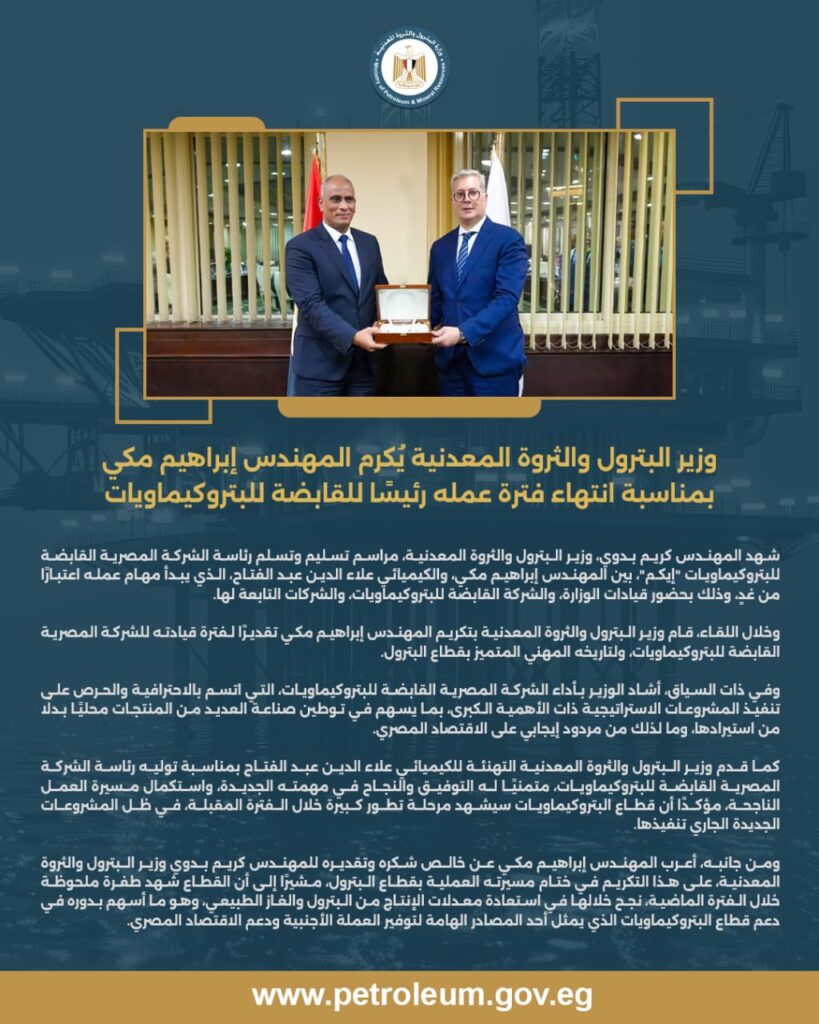وخلال اللقاء، قام وزير البترول والثروة المعدنية بتكريم المهندس إبراهيم مكي تقديرًا لفترة قيادته للشركة المصرية القابضة للبتروكيماويات، ولتاريخه المهني المتميز بقطاع البترول.