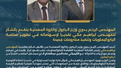 كتبت هناء حسيب أعرب المهندس كريم بدوي وزير البترول والثروة المعدنية عن خالص شكره وتقديره للمهندس إبراهيم مكي رئيس الشركة…